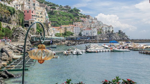 Una cartolina: i tavoli nella terrazza sul mare, i lampioncini, lo sciabordio dolce delle onde e il mosaico di casine e luci che si inerpicano sulla roccia in quell’incanto assoluto che è Amalfi.…