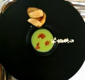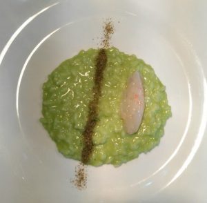 Ma in uno stile che si è fatto via via più vario, risalta anche la linea dei piatti ispirati ai gusti primari, come la scaloppa di foie gras servita con crema acida di kiwi dall’appeal anni ’80, uova di salmone, sapide ma anche amare, e rafano per il piccante, che ripercorre e varia gli equilibri dello storico millefoglie di Berasategui alla mela verde: acidità, ittico, naso impattante. Bilanciamento e istinto.