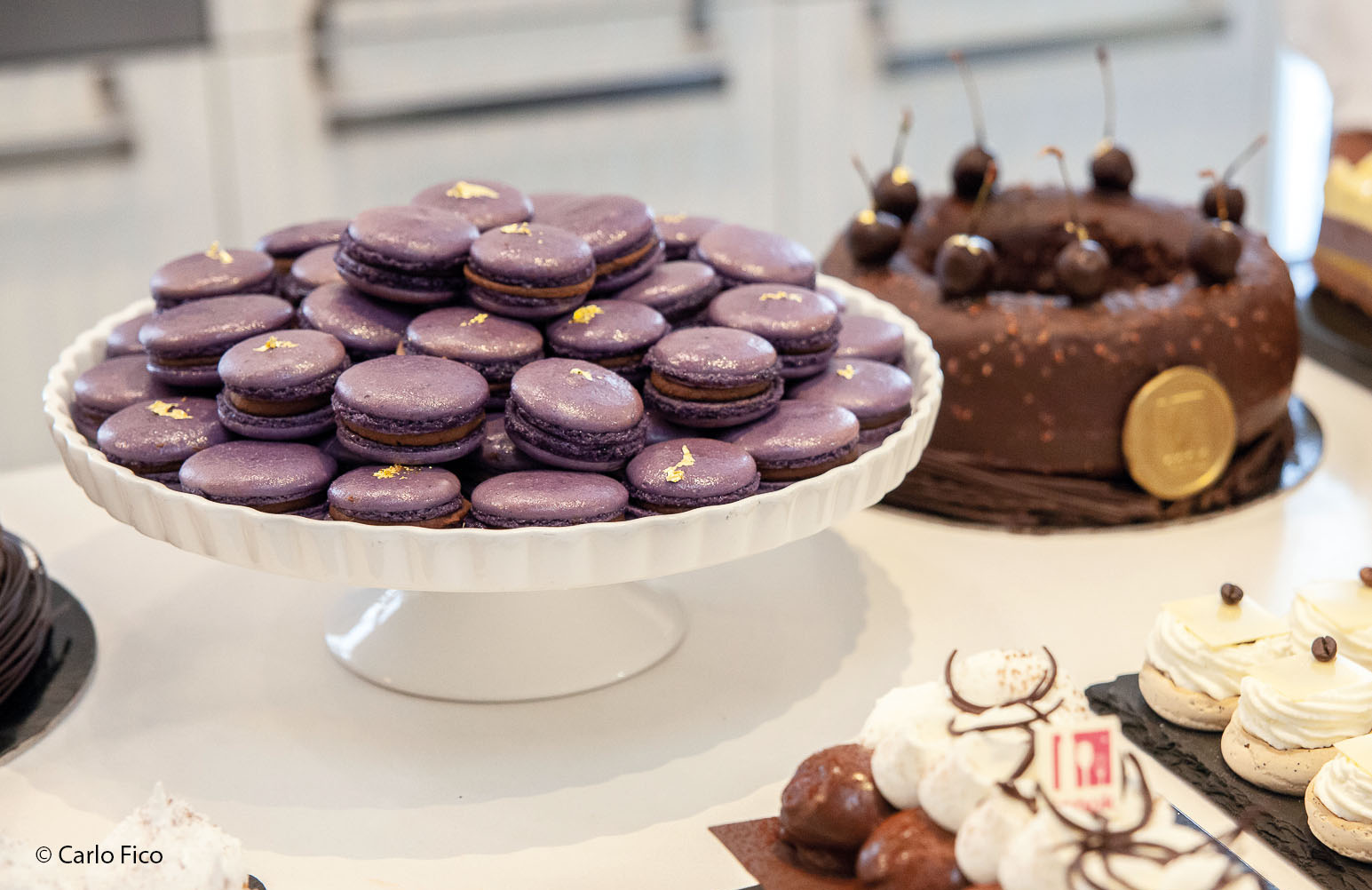 Per i macaron: g. 500 di mandorle in farina, g. 210 di acqua, g. 25 di Meringana fast, g. 500 di zucchero a velo, g. 500 di zucchero semolato, g. 125 di acqua, g. 150 di acqua, g. 25 di Meringana fast, g. 5 di colore alimentare viola idrosolubile, g. 10 di liquirizia in polvere.