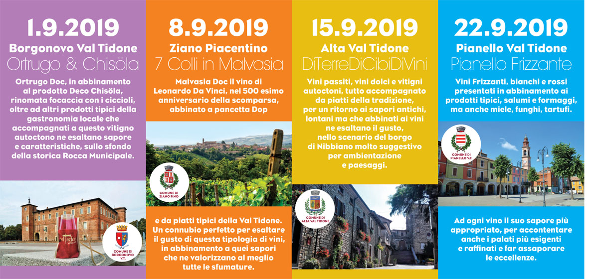 La più grande rassegna del vino piacentino è ormai entrata a tutti gli effetti negli appuntamenti clou non solo della Val Tidone ma di tutta la provincia e, come ogni anno, Vi aspetta nei weekend del mese di settembre. Per gli amanti del buon vino, degustazioni di Ortrugo, Gutturnio, Malvasia e Passito faranno scoprire una varietà di aromi, sapori, gusti e sfumature in grado di accontentare tutti i palati. Il “ValTidone WineFest” non è solo degustazione di vino e di prodotti tipici, ma anche concerti, cene, eventi di intrattenimento anche fuori provincia, visite guidate. Il tutto in località suggestive della Val Tidone, posti incantati che sveleranno vedute e panorami da favola.