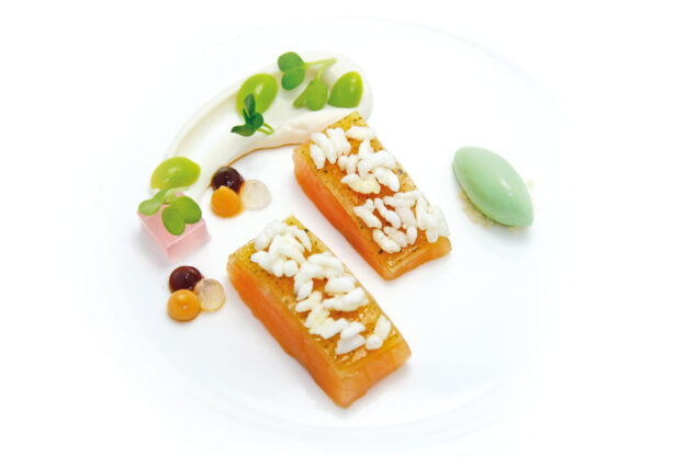 INGREDIENTI per 4 persone Per il sottaceto del salmone alpino g. 300 di filetto di salmone alpino, g. 16 di zucchero, g. 22 di sale grosso, scorza di 1 limone biologico, 20 Takuan…