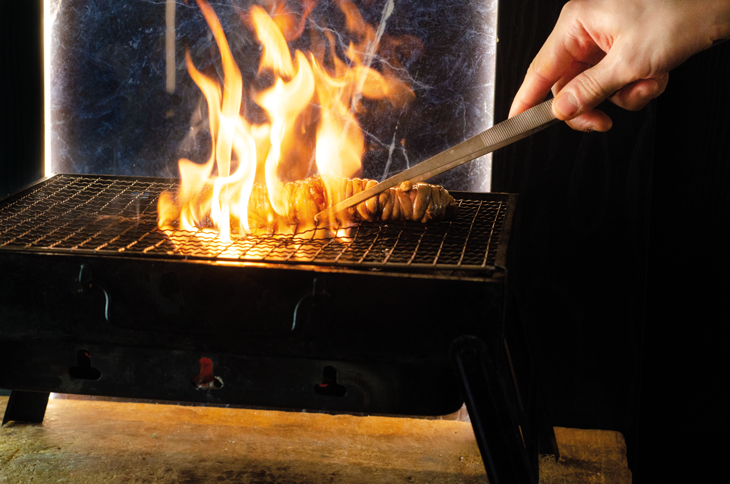 Calamaro ripieno di baccalà con polenta di farina bona, gel di cavolo viola e olio ortice