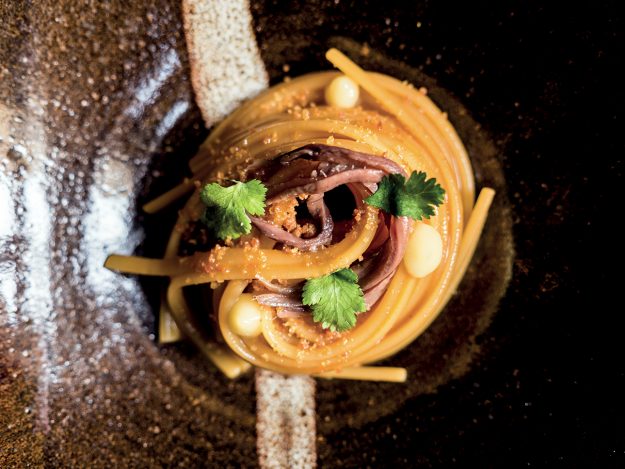 Ingredienti g. 340 di linguine 8 peperoni rossi 5 cucchiai di olio 1 spicchio d’aglio 1 mazzetto di coriandolo fresco 20 alici del Cantabrico sott’olio bottarga dell’Armagnac Procedimento Cospargere di olio 7 peperoni…