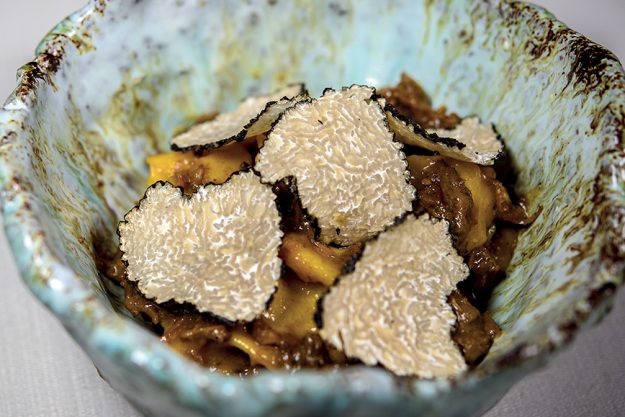 Farfalle di pasta fresca al ragù di cortile e tartufo nero