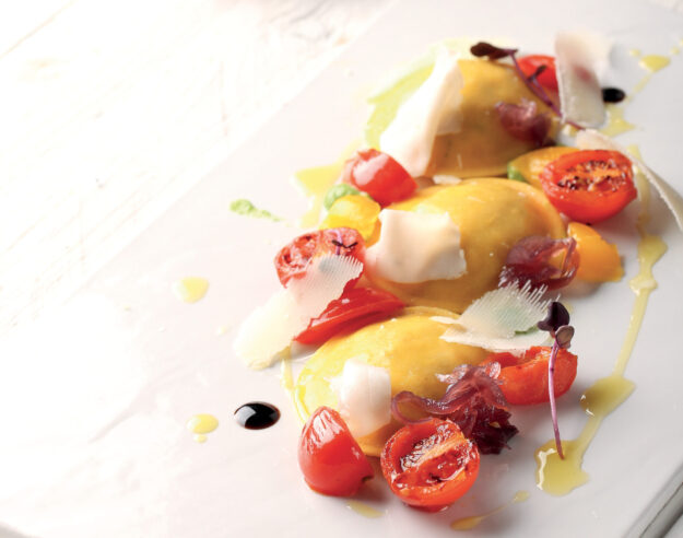 INGREDIENTI per 4 persone 12 Panciotti con finferli e fontina DOP Divine Creazioni Surgital, 12 pomodori datterini gialli, 12 pomodori ciliegino, 12 fette di lardo, aceto balsamico tradizionale aglio rosso di Sulmona, scalogno,…