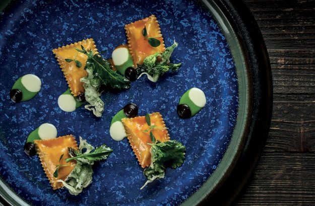 INGREDIENTI per 4 persone 16 Bauletti ripieni all’astice Divine Creazioni Surgital 16 cime di rapa tornite crude, condite con citronette allo yuzu 16 foglie piccole di cime di rapa in tempura (tempura composta…