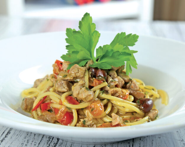 INGREDIENTI per 4 persone g. 300 di spaghettoni, olio extravergine, 1 spicchio d’aglio, g. 300 di tonno dell’Adriatico, g. 300 di pomodori datterini, g. 150 di olive taggiasche, vino bianco, sale, pepe, peperoncino…