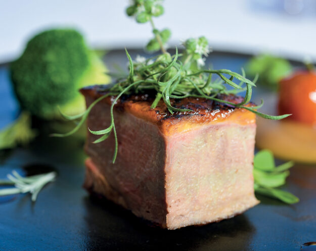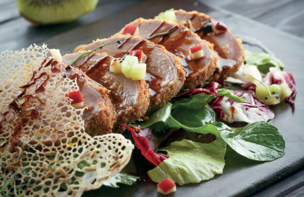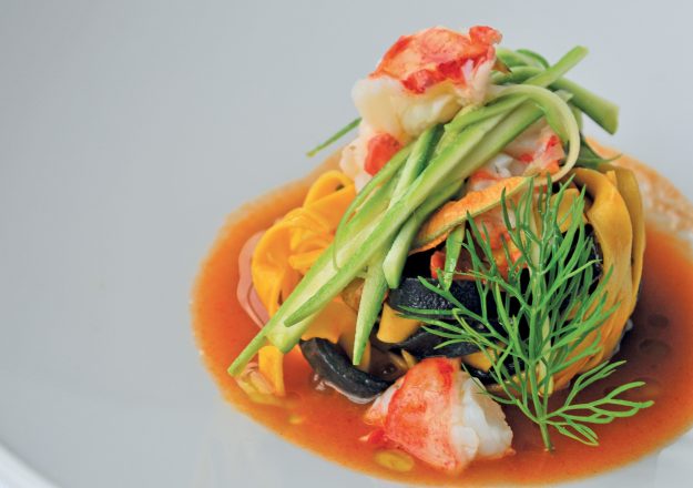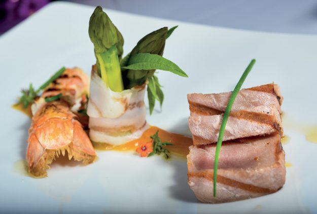 INGREDIENTI 1 filetto di tonno rosso punte d’asparagi 1 scampo 1 cucchiaio di mostarda piccante di albicocche 2 fette di pancetta olio extravergine d’oliva sale PROCEDIMENTO In un tegame dai bordi bassi scottare…