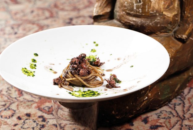INGREDIENTI g. 800 di anguilla aperta e privata della spina dorsale, 2 radicchi tardivi, g. 400 di fumetto di pesce e gusci, aceto di riso, polvere di carboni vegetali (per ricreare la sensazione…