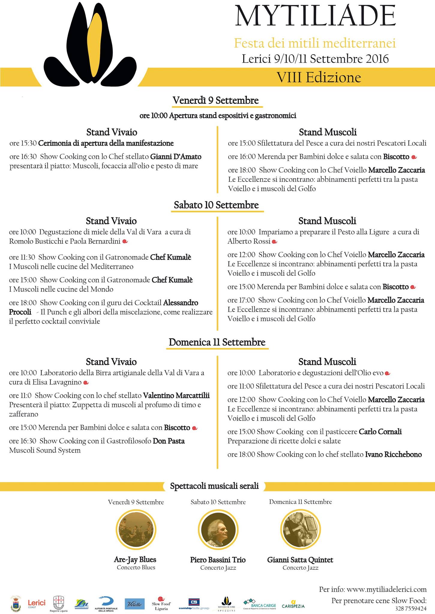Durante i tre giorni di Mytiliade il borgo marinaio di Lerici si trasformerà in un meraviglioso palcoscenico naturale, dove si potrà partecipare a pranzi e cene, degustazioni guidate, gite in barca, stand di delicatessen, show cooking condotti da importanti firme della cultura gastronomica italiana e internazionale, alla scoperta di un territorio da godere e da gustare tra terra e mare, concerti, spettacoli… e molto altro ancora.