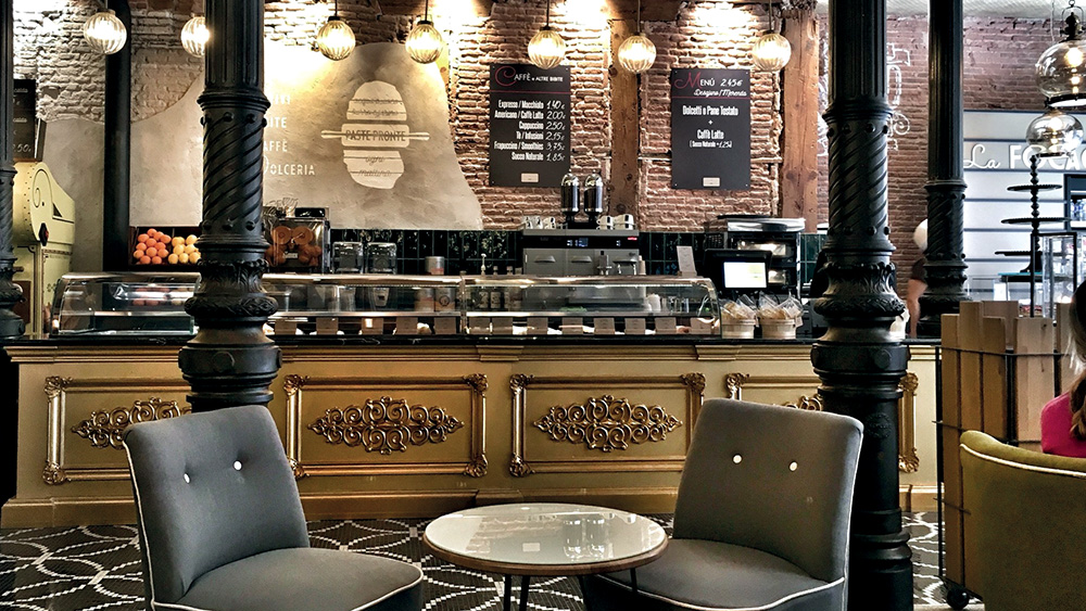 Divani in pelle, poltrone di velluto e ben quattro frontali dei banconi tutti diversi tra loro, a formelle di metallo, in legno con finiture in oro, in legno con inserti di specchio e di marmo nero marquinia e bardiglio, rendono La Focaccella il luogo ideale per una sosta all’insegna del relax e del piacere.