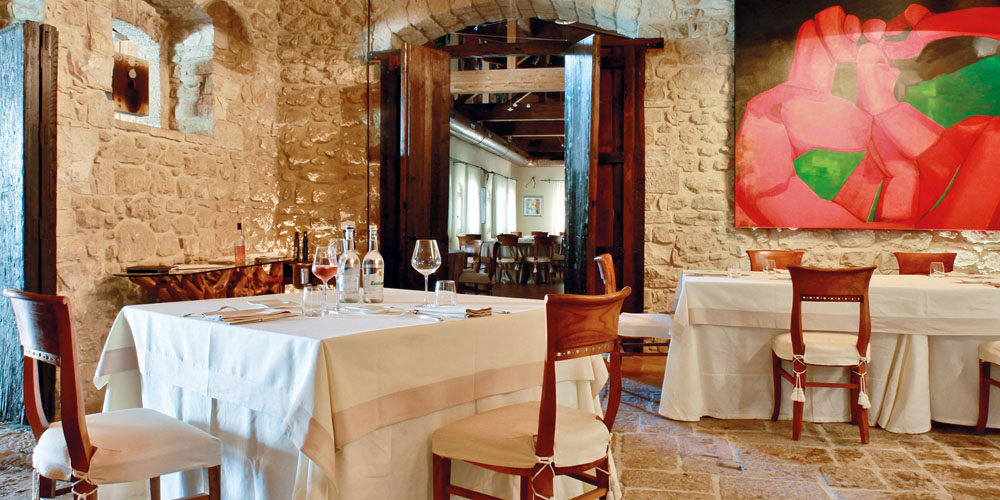 Ebbene ci crediamo anche noi, crediamo nel concetto di bellezza incontaminata di questa terra sospesa tra due mari che molto poco – forse troppo poco – ne influenzano l’economia; una regione che ancora non conosce il turismo di massa e che, però, proprio per questo motivo restituisce, a chi ha la sensibilità giusta per apprezzarla, sensazioni ineguagliabili. Eppure in questa regione ci sono chicche come il borgo de Le Masserie del Falco, una struttura molto bella, dotata di 28 belle camere, 2 Suite, 3 Junior Suite e 8 appartamenti. Il ristorante Lo Scrigno dei Sapori è ricavato nella vecchia stalla, con pavimenti in chianche, muri in pietra a vista e numerosi elementi in legno antico, con quadri di valore e raffinato gusto appesi alle pareti. Una delle pareti è addirittura un grande pezzo di roccia che testimonia come, anticamente, si tendeva a utilizzare quanto la natura offriva per poi completare il lavoro con l’opera dell’uomo. Molto bella la porta d’ingresso, massiccia, recuperata a nuovo splendore dopo un sapiente lavoro di restauro.