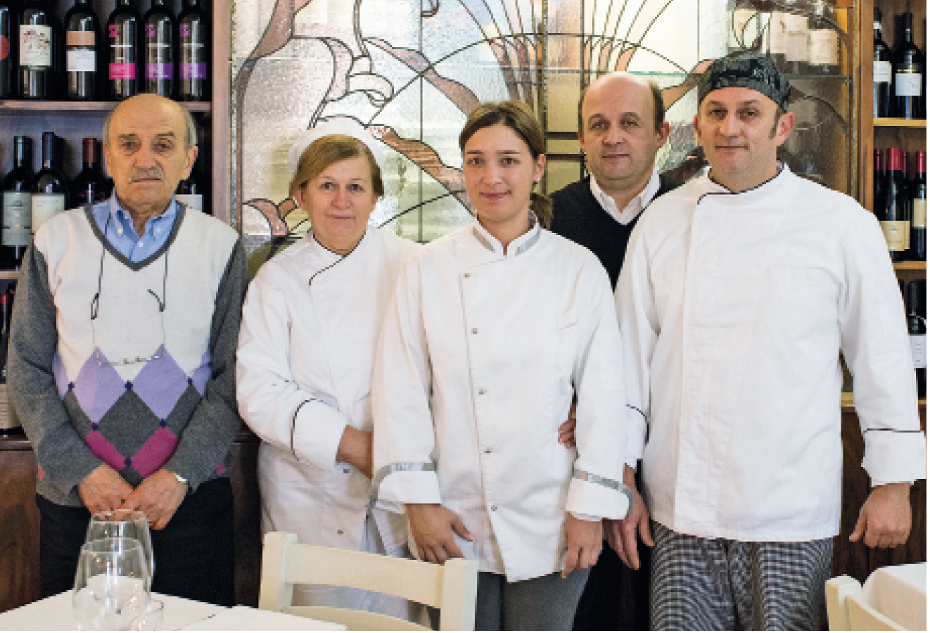Il timone del ristorante, oggi, è in mano alla quarta generazione. In cucina troviamo una brigata che ha in Massimiliano e nella mamma Verdiana i suoi pilastri. Il primo si occupa dei secondi piatti, la seconda è addetta ai primi a partire dalla preparazione delle paste fresche tutte “tirate” rigorosamente al mattarello. Per citare il più illustre cittadino di Forlimpopoli, la signora Verdiana potrebbe essere definita “la Marietta” (cuoca e governante dell’Artusi) o, come si dice da queste parti, l’Arzdora, cioè il pilastro nella tradizione di famiglia. In sala, invece, troviamo il figlio Stefano e il papà Mauro che sovrintendono al servizio coadiuvati da due camerieri.