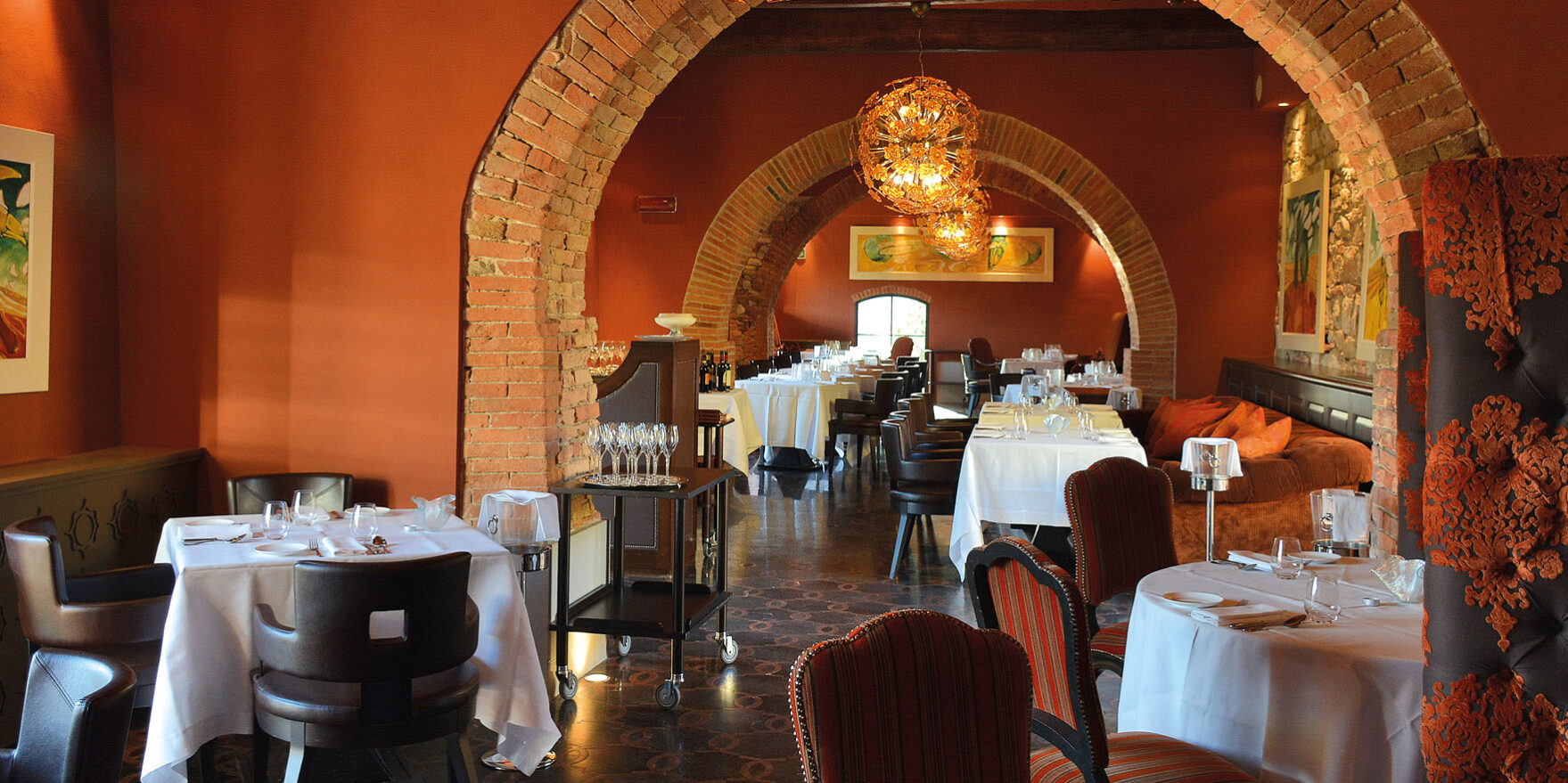 Chiude in bellezza l’offerta gastronomica il ristorante Tosca, ambiente raffinato, molto curato nei minimi particolari, dove atmosfera, colori, forme e servizio ti fanno capire cosa voglia dire fare ristorazione e accoglienza ad alti livelli. Sviluppato in lunghezza sul fianco di un ampio cortile interno, accoglie un massimo di 40 coperti disposti in modo comodo tra tavoli e piacevoli separé. Una fascinosa e imponente enoteca a vista offre in vetrina etichette ricercate e ben 7 persone si muovono con professionalità in sala per soddisfare ogni più piccolo capriccio della clientela, suggerendo e consigliando in più lingue.