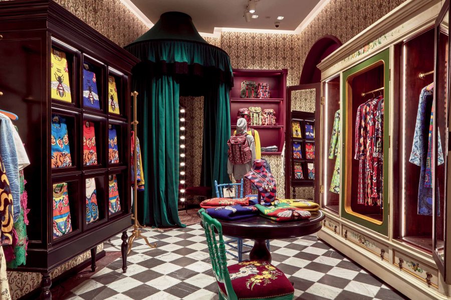 È il Gucci Garden (foto sopra), così chiamato per il ricorrere di motivi animalier o fitomorfi e quale repertorio di metafore sempreverdi.
