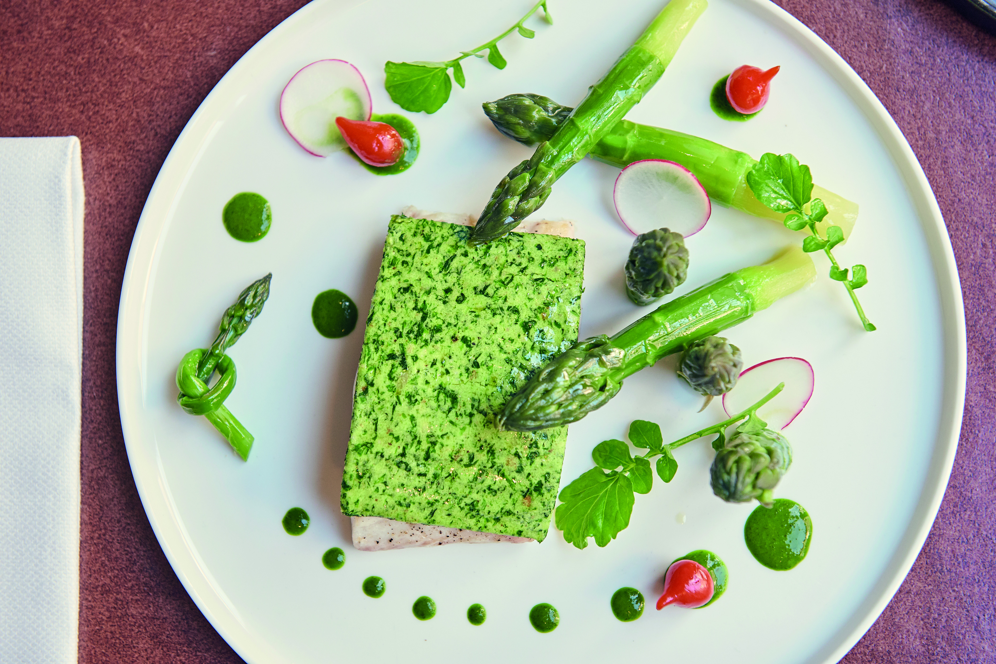 Ispirazione immediata, invenzioni all’ultimo minuto, di stagione, chilometro 0 eccetto il pesce che compriamo dalla Francia; una cucina leggera, digeribile, a base di prodotti locali. Amo sperimentare con spezie, erbette e tè. Non utilizzo quasi mai burro o panna.