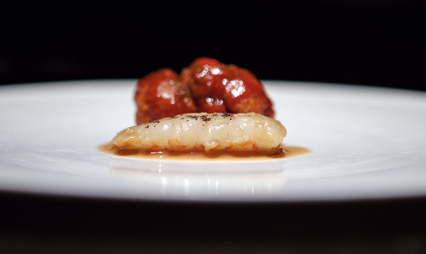 L’inizio vero e proprio è affidato alla finanziera di scampi, tanto per non far sorgere dubbi sulle radici piemontesi. Un cuoco che si rispetti non può far mancare la scaloppa di foie-gras, che Trentini presenta con carciofi e oliva taggiasca (accostamento che forse non contempera alla perfezione l’amaro del carciofo con la dolcezza della taggiasca) e nemmeno un tocco di caviale, accoppiato a rombo e salsa olandese. Un classico inamovibile dalla carta è la tartare di gamberi e lingua al mandarino, un piatto elegante e bipartito in due, con una doppia anima che si fonde in un unico boccone.