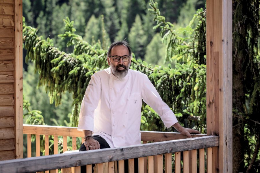 Umile come una formica laboriosa contro un gigante di granito, Norbert è grato alle sue vette imperiose perché avverte il sublime insito nella loro grandezza e nelle infinite sfumature dei prodotti che generosamente dispensano attraverso il duro lavoro dei contadini. Per questo al St. Hubertus di San Cassiano – quest’anno premiato appunto dalla Michelin con il massimo riconoscimento – da tempo ha smesso di utilizzare ingredienti “da ristorante stellato”. Ha accantonato foie gras, caviale, pesci di mare e più recentemente anche gli agrumi, di improbabile coltivazione nel suolo dolomitico. “Se mi serve l’acido, lo cerco altrove”, dice. Ha persino sostituito l’olio d’oliva con l’olio di vinacciolo, che aromatizza in casa con aneto, verbena, basilico. Lavora a contatto con contadini di monte e di valle che gli mettono a disposizione trecento tipologie di verdure ed erbette, venticinque tipi di carote, centinaia di erbe alpine, foglie di amaranto, cipolle selvatiche ecc. Per non parlare dell’utilizzo di fieno, pigne, pinoli, Graukase (“il formaggio più magro del mondo”), resina di pino mugo, selvaggina, pesci d’acqua dolce. La sua è ormai una cucina dalle cento sfumature, di grigio della montagna e di verde della valle: del terroir che interseca visione, passione e tradizione. Quasi una Trinità.