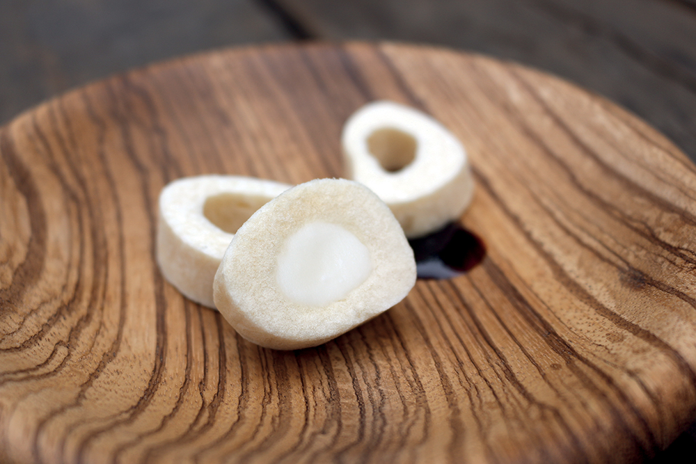 Questo piatto rappresenta l’idea di “mangiare ciò che non è concepito per essere mangiato”, ossia un osso. Per questo, viene utilizzato il midollo osseo, parte interna dell’osso: si prepara un caldo di carne di manzo con latte. Una volta che assimila tutto il sapore, si cola e si emulsiona con agar agar. Si inserisce in uno stampo e si congela a -40°C. Il prodotto finale si liofilizza tra le 24 e le 48 ore. Risultato: un osso croccante con sapore carnico con ripieno di midollo cremoso.