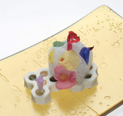 Questo piatto rappresenta l’origine: un nido d’ape realizzato con una stampante 3D e tinto con una varietà di fiori, da cui le api ottengono il polline. L’Impollinazione è inoltre accompagnata dall’ACQUA DELLA GRATITUDINE, che mira ad accogliere e ringraziare l’ospite per la sua visita.