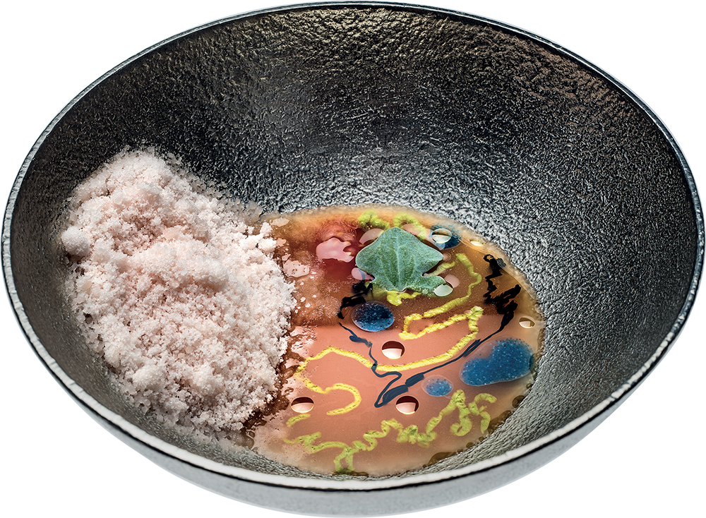 Al momento risalta in particolare Levante, dedicato al vento che porta pioggia e temporali: sul piatto è raffigurata una spiaggia dopo la tempesta, disseminata di alghe, stelle marine e ricci, ma anche cocci di bottiglia. Oppure Impollinazione, con il suo simbolismo delle origini: l’alveare, con i diversi fiori da cui le api ricavano il polline, è realizzato in meringa con la stampante 3D; si accompagna all’acqua di gratitudine, benvenuto e ringraziamento all’ospite per la sua visita. E ancora Mangiando ossa, provocazione sull’incommestibile a base di midollo.