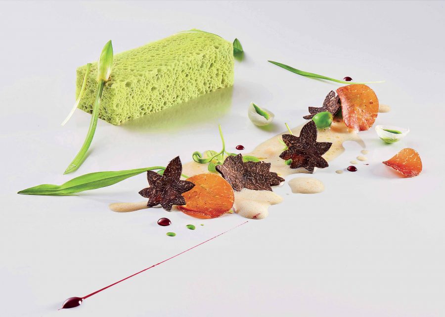 Gli antipasti d’autore pescano nella memoria gustativa, variando le presentazioni. Vedi la frittatina sifonata (foto sotto, a destra) e finita in forno, parallelepipedo spumoso servito con tartufo estivo e coulis di aglio orsino, entrambi del Monte Baldo. A conferirle corpo e struttura, profumi e acidità è la salsa sempre al Vinappeso, sobbollito fino a ottenere un brodo e poi un ristretto, addizionato al Bimby di panna e Parmigiano. Oppure le lumache, stufate e spadellate con il classico complemento di burro e clorofilla di prezzemolo, più succo di limone, erba cipollina e scalogno crudo; su ciascuna di esse è adagiato un petalo di rosa di Gorizia in agrodolce, più pesto di rucola alla senape montato all’olio, tipo maionese, cubetti di Monte Veronese, pinoli tostati, foglie di romice sanguineo e cumino selvatico. E ancora il salmerino del lago di Garda (foto qui sopra), marinato e leggermente affumicato come se fosse salmone, servito a bâtonnet con citronette, uova di salmerino fresche e scaldate, frullate e montate come una maionese all’olio, cialda di pelle croccante. 100% salmerino, o quasi, contrastato nella grassezza e nella sapidità da una cascata di acetosella. Riprendono un formato della casa, ripassato per la trafila marchesiana, gli straccetti di pasta all’uovo, mantecati con burro e parmigiano. Sono conditi con uova embrionali di gallina grigia di Verona, passate leggermente in salamoia e al vapore, per una consistenza più soda, una zuppetta di asparagi bianchi di Verona ottenuta dalla purea allungata con il centrifugato e una salsa spumeggiante del centrifugato stesso, cannella e noce moscata. Un matrimonio indissolubile eppure costantemente rinnovato fra testure vischiose e grassezze.