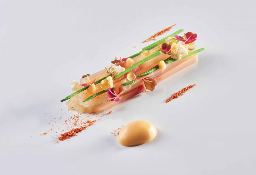 Chiude la bavarese al caramello salato con liquore d’erbe del Monte Baldo, gelato di zucca di Nogara, chips di Isomalto e kumquat confit, in equilibrio fra dolcezza, sapidità, amaro e note agumate.
