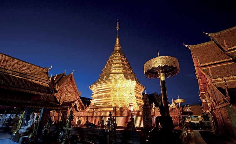 Il tempio Suan Dok, costruito a Chiang Mai nel secolo XIV, ha l’edificio principale aperto ai quattro lati. Tutto intorno ci sono diversi “chedi” contenenti le ceneri dei governatori della città. Il suo stupa principale contiene una reliquia del Buddha che, secondo la leggenda, si sarebbe miracolosamente duplicata. Il duplicato fu posto sul dorso di un elefante bianco che fu lasciato libero di girovagare in attesa che si fermasse ed indicasse il luogo dove far sorgere un nuovo wat per custodire la reliquia. L’elefante si diresse sul monte Doi Suthep, dove si fermò e morì. In questo posto, nel 1383 venne eretto il Wat Phrathat Doi Suthep. Vi si accede per mezzo di una scalinata di 300 gradini, oppure utilizzando una piccola funicolare, fiancheggiata da due muretti a forma di serpenti Naga con mosaici colorati e scintillanti. All’interno del Wat si trova uno dei chedi (o stupa) più venerati (e fotografati) dell’intera Thailandia, completamente ricoperto in foglia d’oro. Il tempio è un centro di venerazione popolare, ospita una vasta comunità monastica ed un’interessante scuola di meditazione, la Doi Suthep Vipassana Meditation Center, aperta a tutti coloro che sono interessati ad approfondirne le tecniche secondo i principi buddisti.