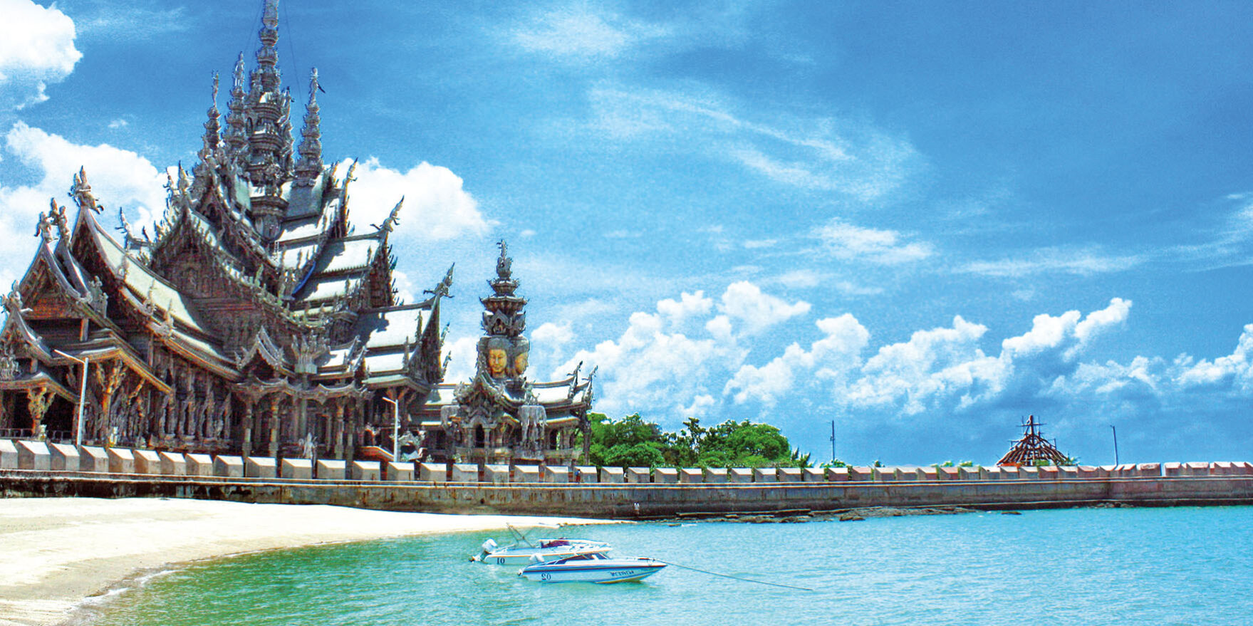 I lavori sono cominciati all’inizio degli anni ’80 e non sono ancora terminati, anche se una data prevista per la conclusione è stata azzardata: il 2025. Ma non si procede affatto con pigrizia, non c’è alcuna lentezza o trascuratezza. È presente invece una certosina precisione, incoraggiata da chi ha voluto questo tempio e desidera che sia compiuto con la massima cura, quasi fosse davvero un’opera d’arte senza fine, continuamente aggiornata, come se il lavoro degli artisti la arricchisse ogni giorno grazie alle preghiere dei fedeli. Il Santuario è tutto in legno, ogni centimetro viene intagliato dalle sapienti mani di circa 300 artigiani che non hanno mai usato nemmeno un chiodo. Il loro compito è quello di celebrare la Verità, che nasce dalla religione, dalla filosofia e dall’arte. L’idea originaria fu del miliardario thailandese Thail Khun Lek Viriyaphan, scomparso nel 2000: la sua ambizione era realizzare qualcosa di innovativo. Il tempio domina la baia con un intreccio di guglie, angeli, dei e animali. Si compone di quattro sale dedicate all’iconografia religiosa thailandese, khmer, cinese ed indiana. Una sorta di pantheon orientale nel quale sono rappresentati all’interno i sette elementi creatori – Cielo, Terra, Padre, Madre, Luna, Sole e Stelle – mentre all’esterno sono raffigurati i quattro elementi che possono portare a condurre un’esistenza ideale: la Religione, la Vita, la Filosofia immortale, la Pace.