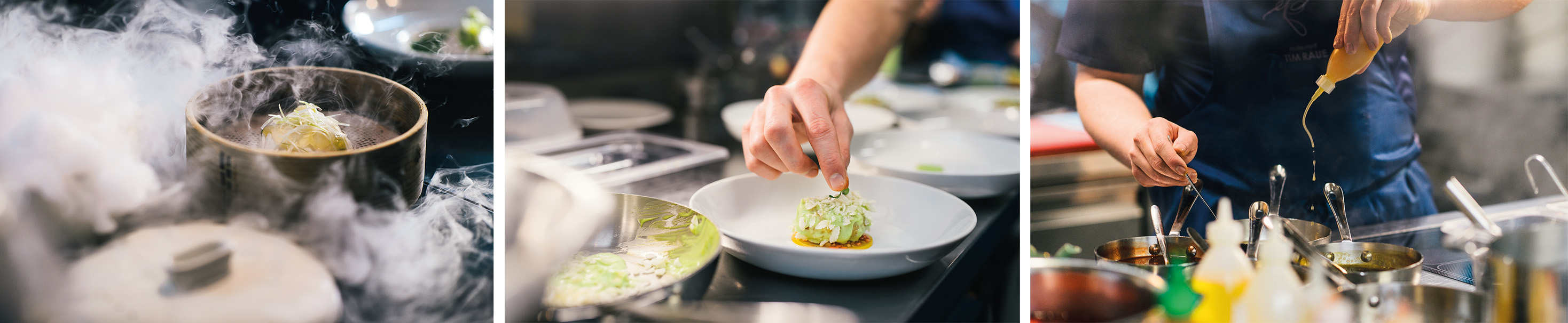 Con lui Marie-Anne (foto a lato), direttrice e sommelier da un indirizzo all’altro (oggi supportata dal restaurant manager André Macionga) (foto a lato), protagonista di una gavetta parallela, tanto paziente quanto instancabile. Ma nel presente di Raue ci sono anche il ristorante Sra Bua del Kempinski Hotel Adlon di Berlino, con una proposta più informale sulla stessa linea della casa madre; tre brasserie Tim Raue a Berlino, Monaco e Costanza con Tertianum Premium Residences, brand di case di riposo deluxe; l’Hanami sulla nave da crociera Tui e Spices a Sylt, pittoresca isola del Mare del Nord. Più varie ed eventuali in agenda, per esempio il ripescaggio del concept tedesco della Soupe Populaire, recentemente chiusa a Berlino.