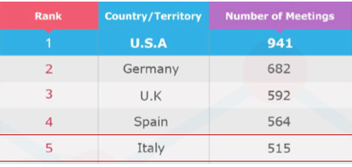 L’Italia scala la classifica mondiale del turismo congressuale posizionandosi tra i primi cinque Paesi nel mondo con 515 meeting internazionali* svolti nel Bel Paese nel 2017 (ENIT su dati ICCA). In testa gli USA (941 meeting), quindi la Germania (682), UK (592), Spagna (564). Dopo l’Italia si posizionano Francia (506 meeting), Giappone (414), Cina (376), Canada (360), Paesi Bassi (307). Roma è la prima città italiana per meeting internazionali. La capitale si colloca invece al 20esimo posto su scala mondiale con 96 meeting. (ENIT su dati ICCA International Congress and Convention Association).