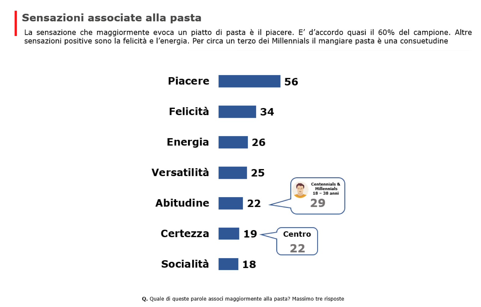 Per il 60% del campione intervistato la pasta evoca una sensazione di piacere. Altre sensazioni positive evocate sono la felicità e l’energia (34% e 26%). Per circa un terzo dei Millennials, mangiare pasta è invece associato a un’abitudine.