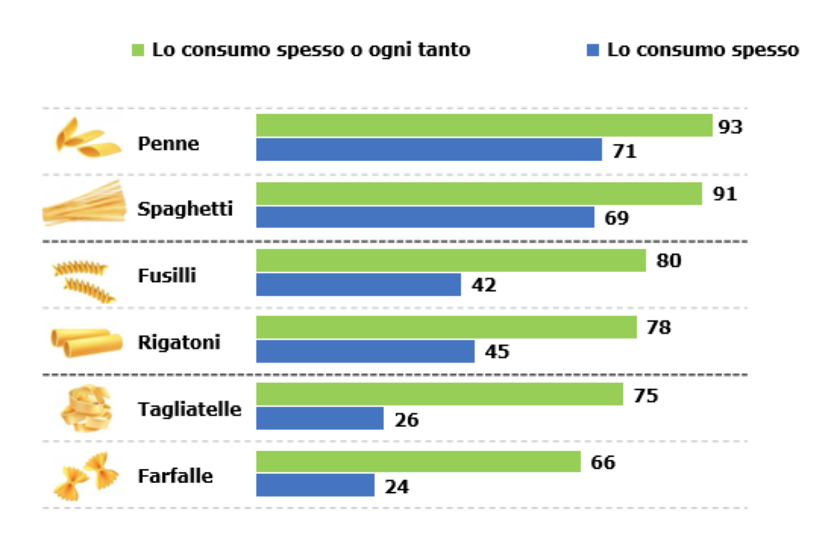 Per quanto riguarda le forme di pasta più amate, al primo posto troviamo a pari merito penne e spaghetti (70% del campione). In particolare le penne sono preferite dagli uomini e dagli under 55 (circa il 70% del campione), mentre per i Baby Boomers (55 – 64 anni) lo spaghetto è il più amato (77%). Le farfalle sono gradite soprattutto dalle donne (31%) e dagli under 55 (26%).
