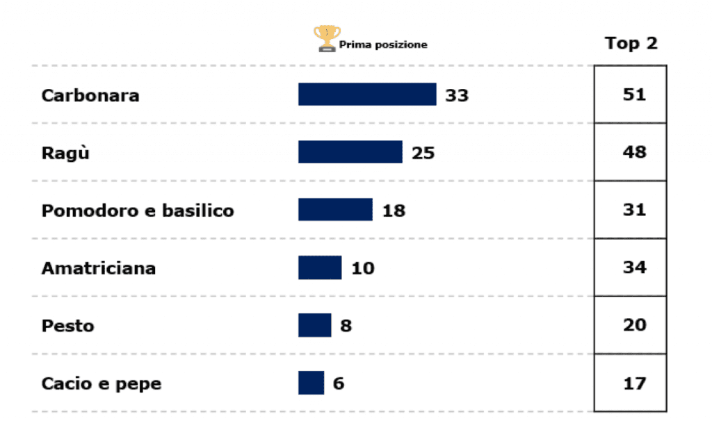 Parlando infine di ricette di pasta preferite, il 33% degli italiani mette sul gradino più alto del podio la carbonara. Al secondo posto si posiziona il ragù (25%), apprezzato specialmente al Sud e nelle Isole. Medaglia di bronzo per un grande classico come il sugo pomodoro e basilico, preferito dai Baby Boomers. L’amatriciana, il pesto e la cacio e pepe, fanno registrare un minor numero di preferenze, probabilmente per le connotazioni più regionali.