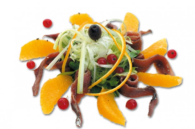 Ingredienti per 4 persone: 12 sarde sotto sale, 2 arance, 4 cipollotti freschi, g. 200 di valeriana, g. 50 di olive taggiasche, 1 rametto di ribes rosso, pepe bianco, olio extravergine di oliva.…