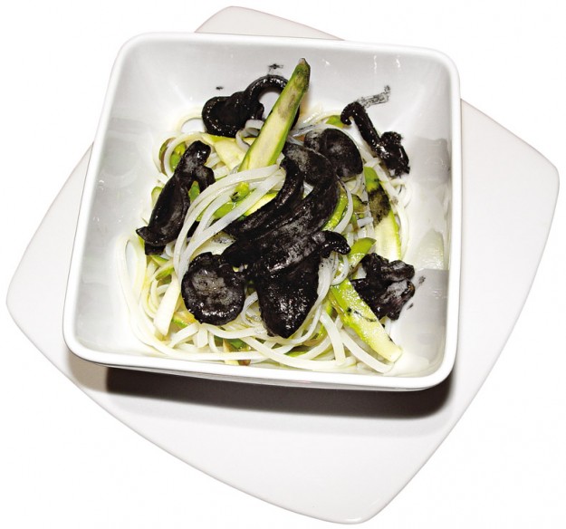 Ingredienti per 4 persone: g. 200 di tagliolini di riso 3 calamari di media grossezza nero inchiostro q.b. 12 asparagi Sale e pepe q.b. dl. 1,5 di olio extravergine di oliva succo…