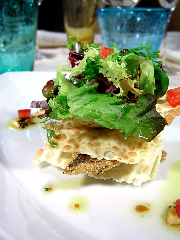 Ingredienti per 4 persone 12 filetti di boga, g. 250 di semola grossa di grano duro con rosmarino tritato, sapa fata con mosto di uva, g. 40 di mandorle tostate e tritate, un…