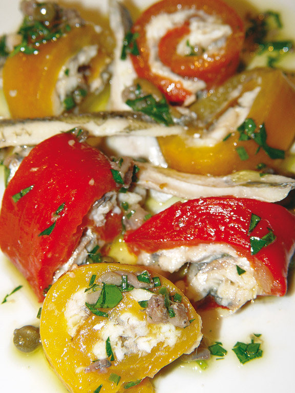 Ingredienti per 4 persone: 2 peperoni (1 giallo 1 rosso) g. 200 di sardoncini già spinati g. 20 di capperi interi finissimi 2 acciughe dissalate tritate dl 1 di olio extravergine di oliva…