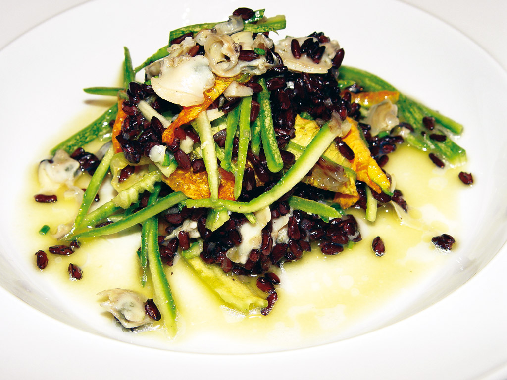 Ingredienti per 4 persone: g. 100 di riso venere, g. 500 di vongole (da aprire), 4 zucchine, 8 fiori di zucca, 1 scalogno tritato, 2 spicchi d’aglio in camicia, dl. 2 di olio extravergine di oliva, dl. 1 di vino bianco, 4…
