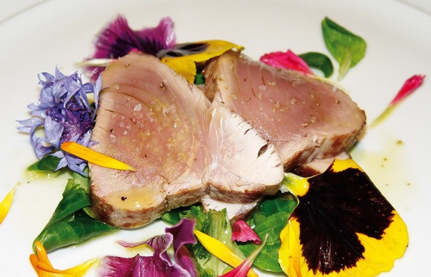 Ingredienti per 4 persone: 1 filetto di tonno fresco da g. 600, 4 spicchi di pomelo, g. 50 di insalatina mista, fiori eduli q.b., 2 spicchi d’aglio, sale grosso di Cervia (riserva Camillona), pepe q.b., 2 fogli di alloro, olio extra vergine…