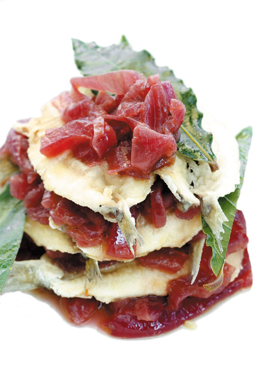 Ingredienti per 4 persone: g. 500 di sgombro, 1 mela verde, basilico, peperoncino fresco, 1/2 limone, colatura di sarde, g. 200 di pomodoro, 2 pomodori S. Marzano, 3 coppapasta tondi piccoli. Preparazione: pulire lo sgombro mantenendo…