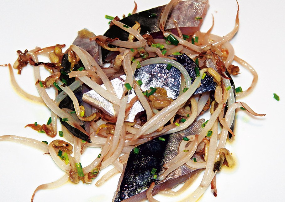 Ingredienti per 4 persone: 2 sgombri di media grossezza, g. 100 di zucchero di canna per marinare, g. 80 di sale fino, pepe in grani, aneto, g. 150 di germogli di soia, 1 scalogno tritato, dl. 1 di olio extravergine…
