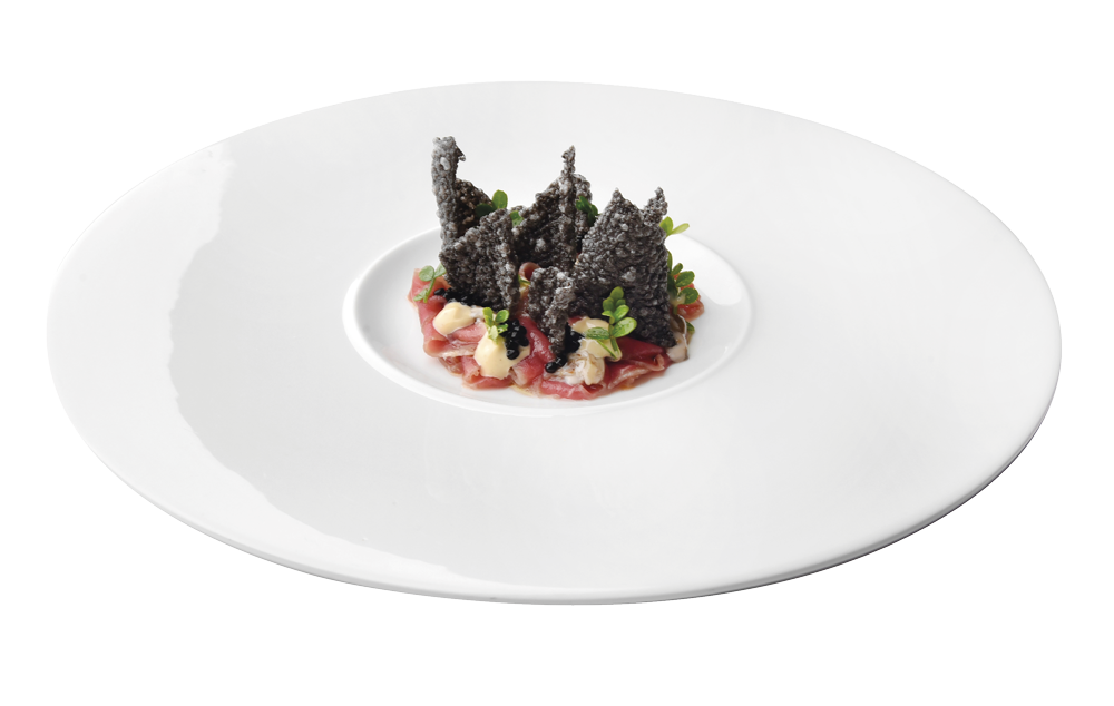 Il piatto per chi ama osare (e non viene deluso): agnello marinato in acqua di mare con maionese all’aglio nero, caviale, ostriche e cialde di riso al nero di seppia dello chef stellato…