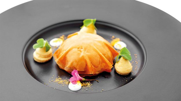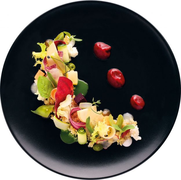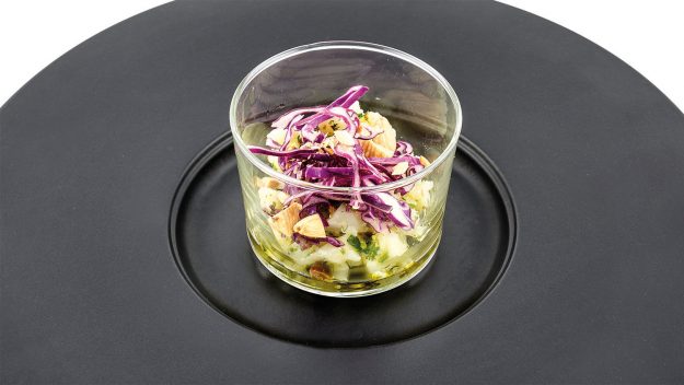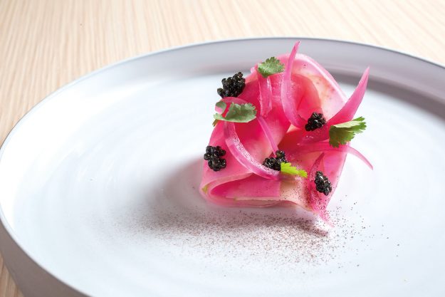 Sfoglia di mela verde, rapa di Chioggia, coriandolo e caviale