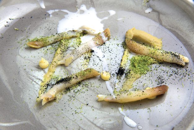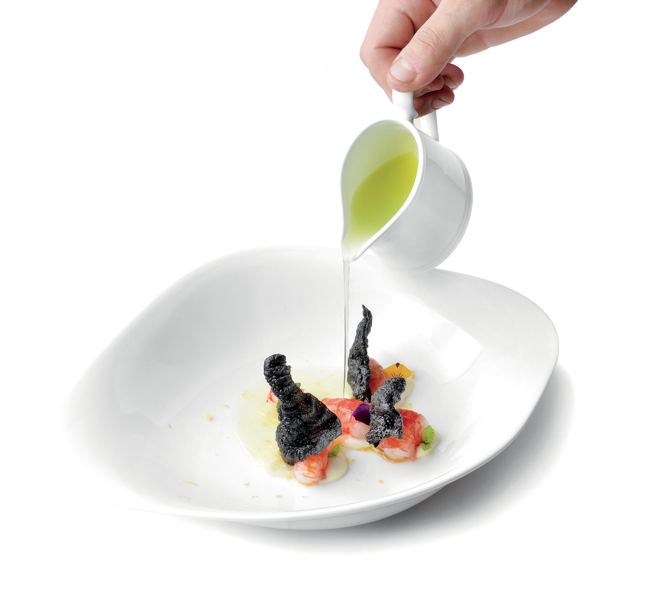 INGREDIENTI per 4 persone 20 cannolicchi freschi dell’Adriatico, olio extravergine di media intensità q.b., polvere al nero di seppia q.b., polvere di prezzemolo q.b., crema di limone al naturale q.b. Per salsa all’aglio…