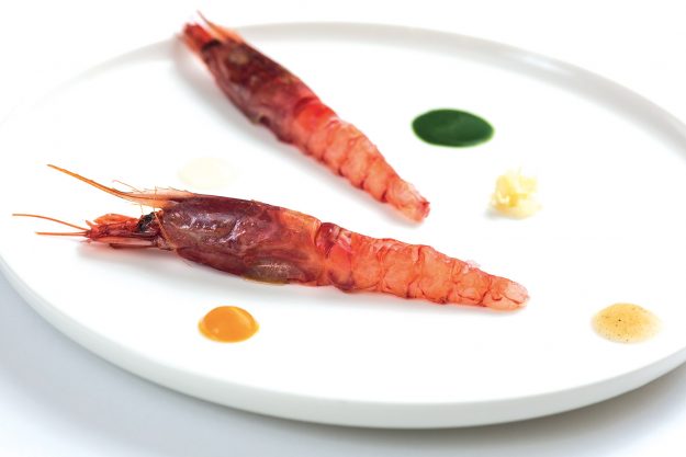 INGREDIENTI per 4 persone 8 gamberi rossi di Mazara di prima scelta, sale Maldon q.b., pepe lungo di Sri-Lanca q.b., olio extra vergine, di oliva Ascolana Tenera q.b., g. 4 di zenzero in…