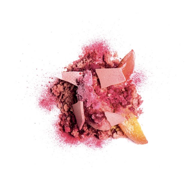 Dessert composto da un cremoso al mango e frutto della passione, una mousse al cioccolato bianco e gelsomino, una terra al cocco e pepe rosa e un gel morbido al mango. CREMOSO AL…