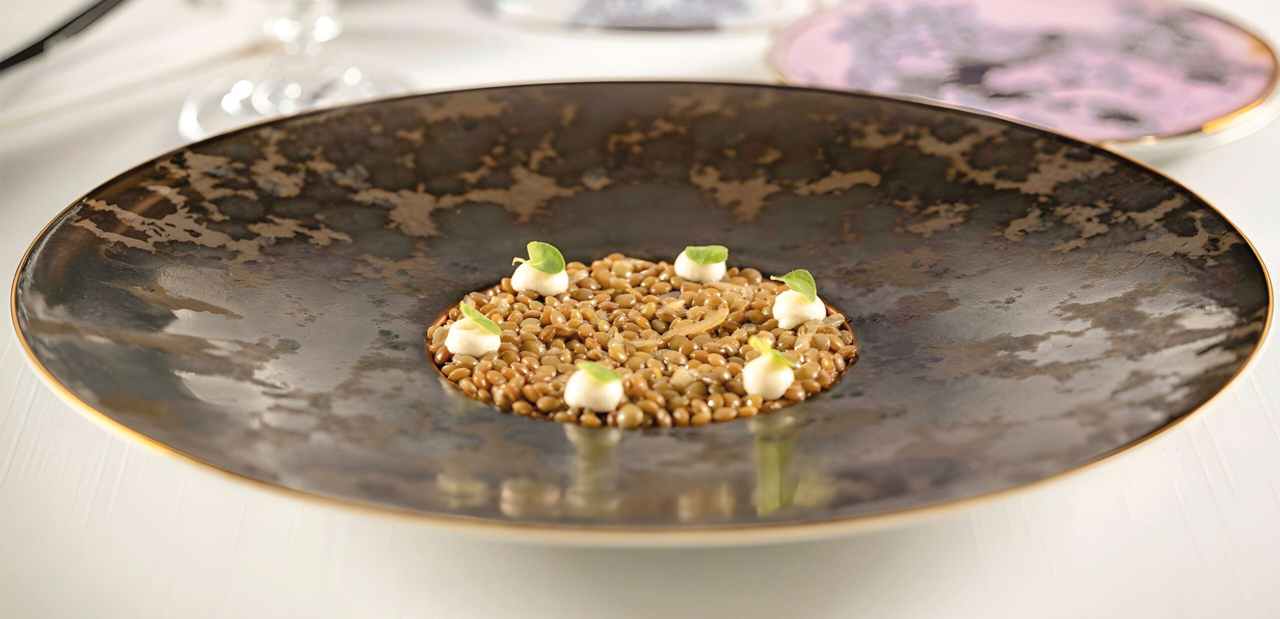 Lenticchie, ghiande e pinolo fermentato, ricetta del ristorante Mater (AR). Ingredienti lenticchie cipolla, carota, salvia (per la cottura) olio extravergine di oliva acqua di cottura delle lenticchie aceto (per la gelatina) scalogno…