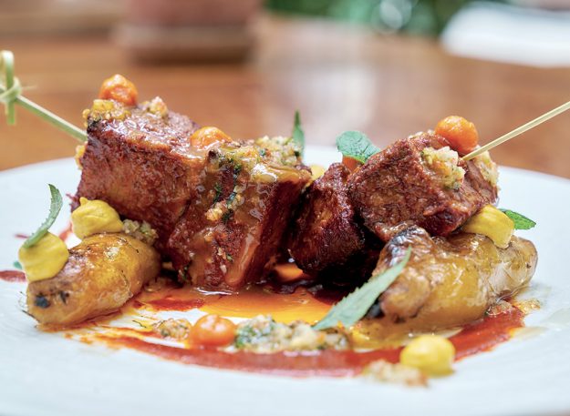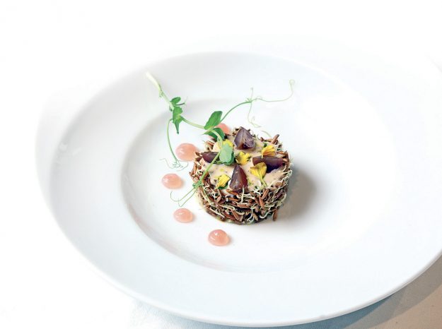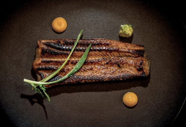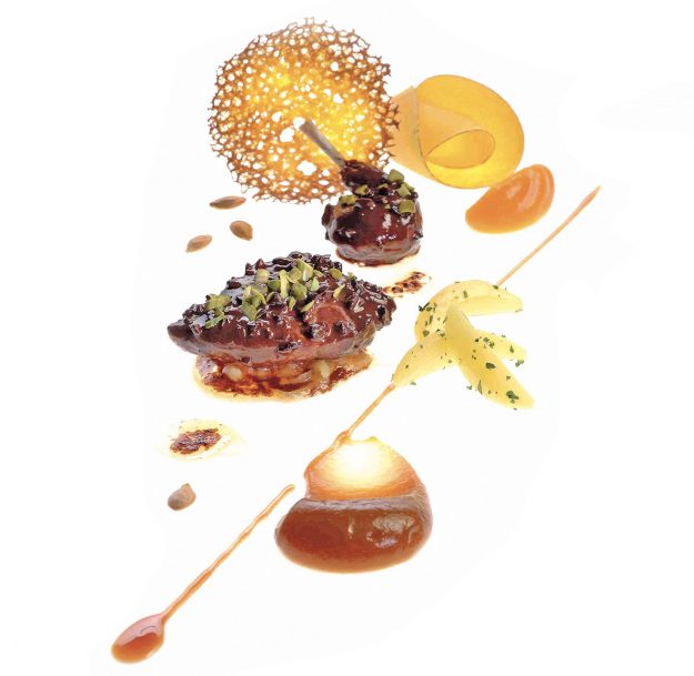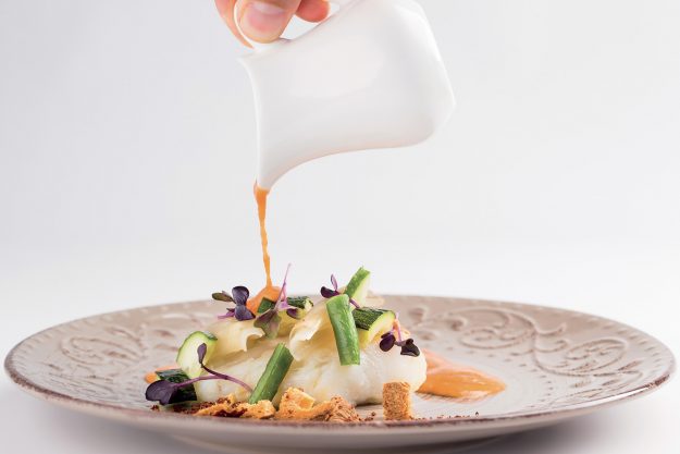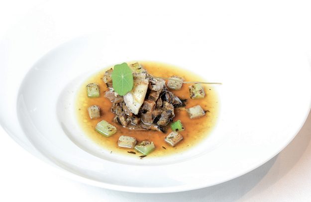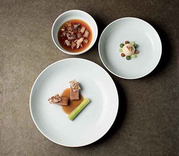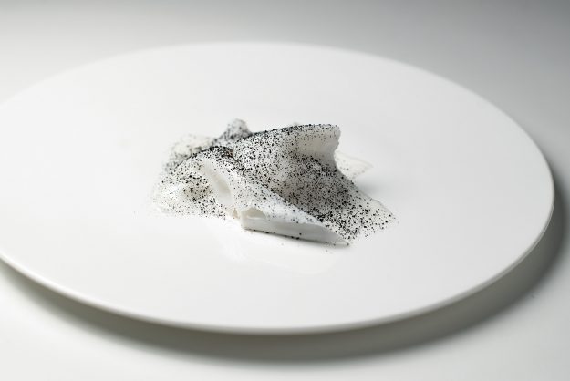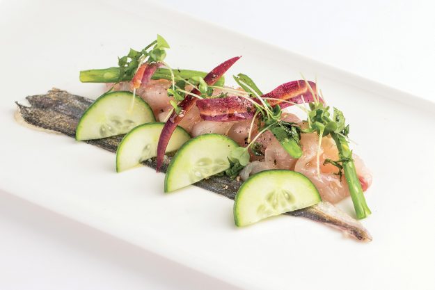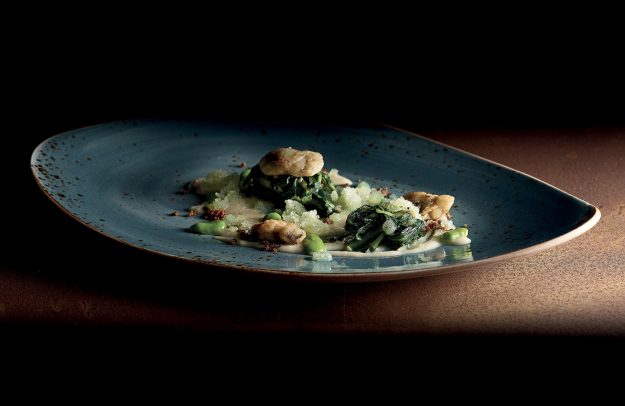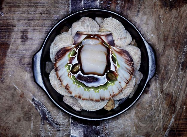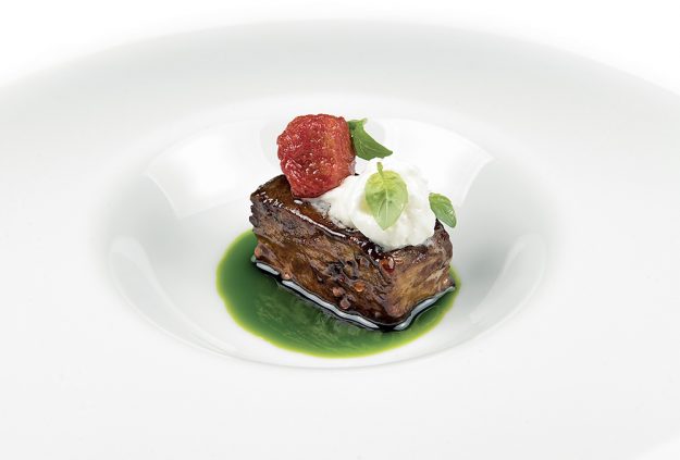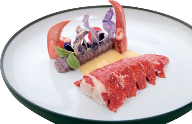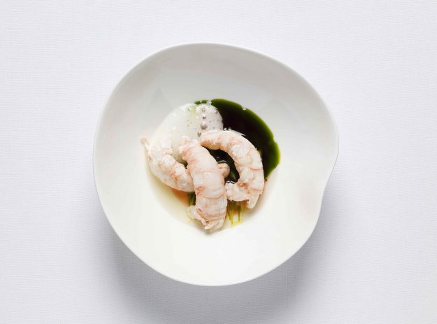 Scampi cotti al naturale, brodo di estrazioni alla fragola e al ciliegino, petrolio di prezzemolo, julienne di asparago crudo