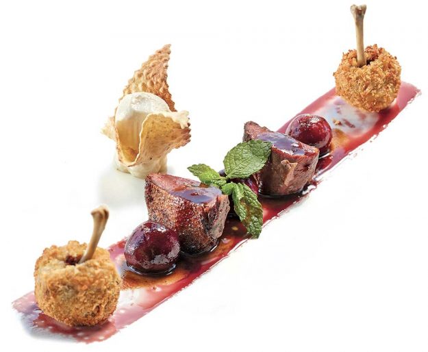INGREDIENTI per 4 persone • 2 piccioni • g. 100 di scalogno • 2 coste di sedano • 2 carote • g. 100 di ciliegie • g. 50 di zucchero • kirsh q.b.…